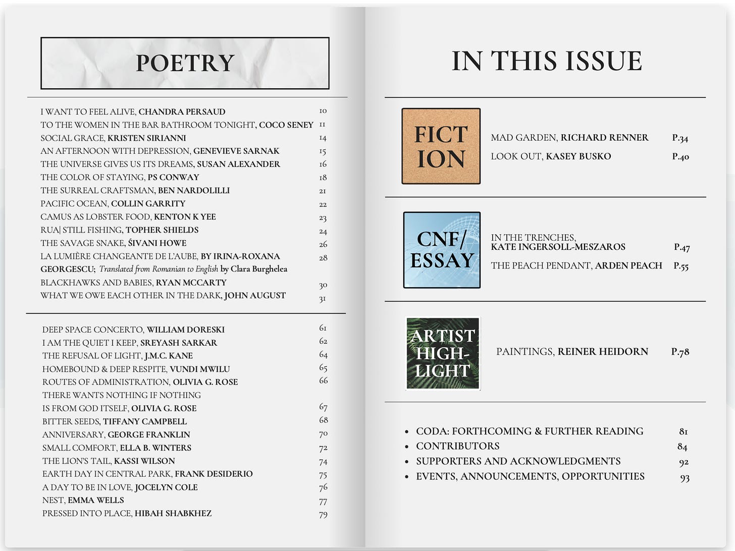 Our journal promotes writing that engages with philosophical, metaphysical, ethical, and existential themes without sacrificing beauty, craft, surprise, or risk.
